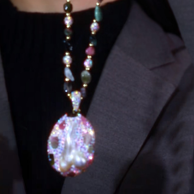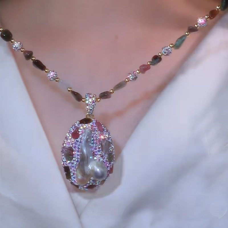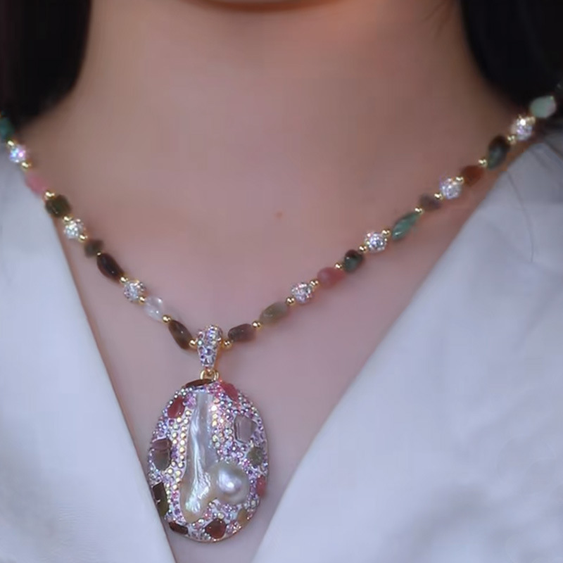 Color: Baroque Tourmaline Pearls and Colored Diamond Sweater Chain, Length 50 cm